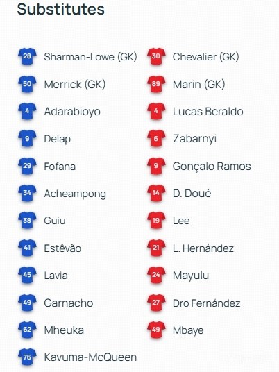 替補:30-舍瓦利耶、89-雷納托-馬林、4-貝拉爾多、6-扎巴爾尼、9-貢薩洛-拉莫斯、14-杜埃、19-李剛仁、21-盧卡斯-埃爾南德斯、24-馬尤盧、27-德羅-費爾南德斯、49-姆巴耶